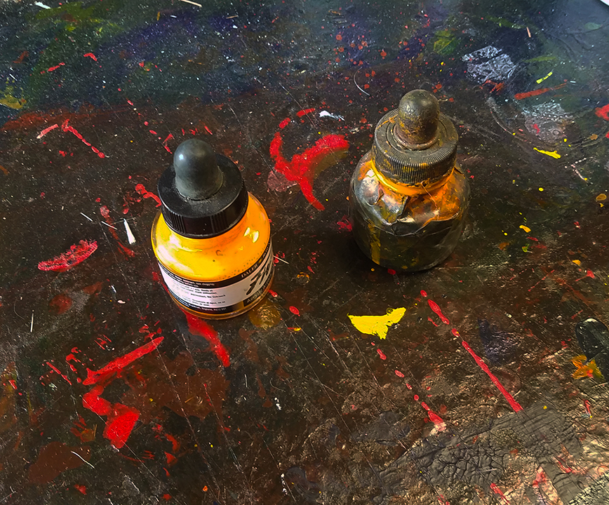 In the photo at the top, I pulled out one of my old ink bottles and placed it on the surface alongside a new bottle of the same color ink. The old bottle should have been discarded years ago but I hold onto it out of some form of nostalgia. It is coated with layers of ink that have become almost black from me handling it with hands stained with many hues for a very long time. Chances are that if you saw any of my work from 2004-2012, this bottle had something to do with it.