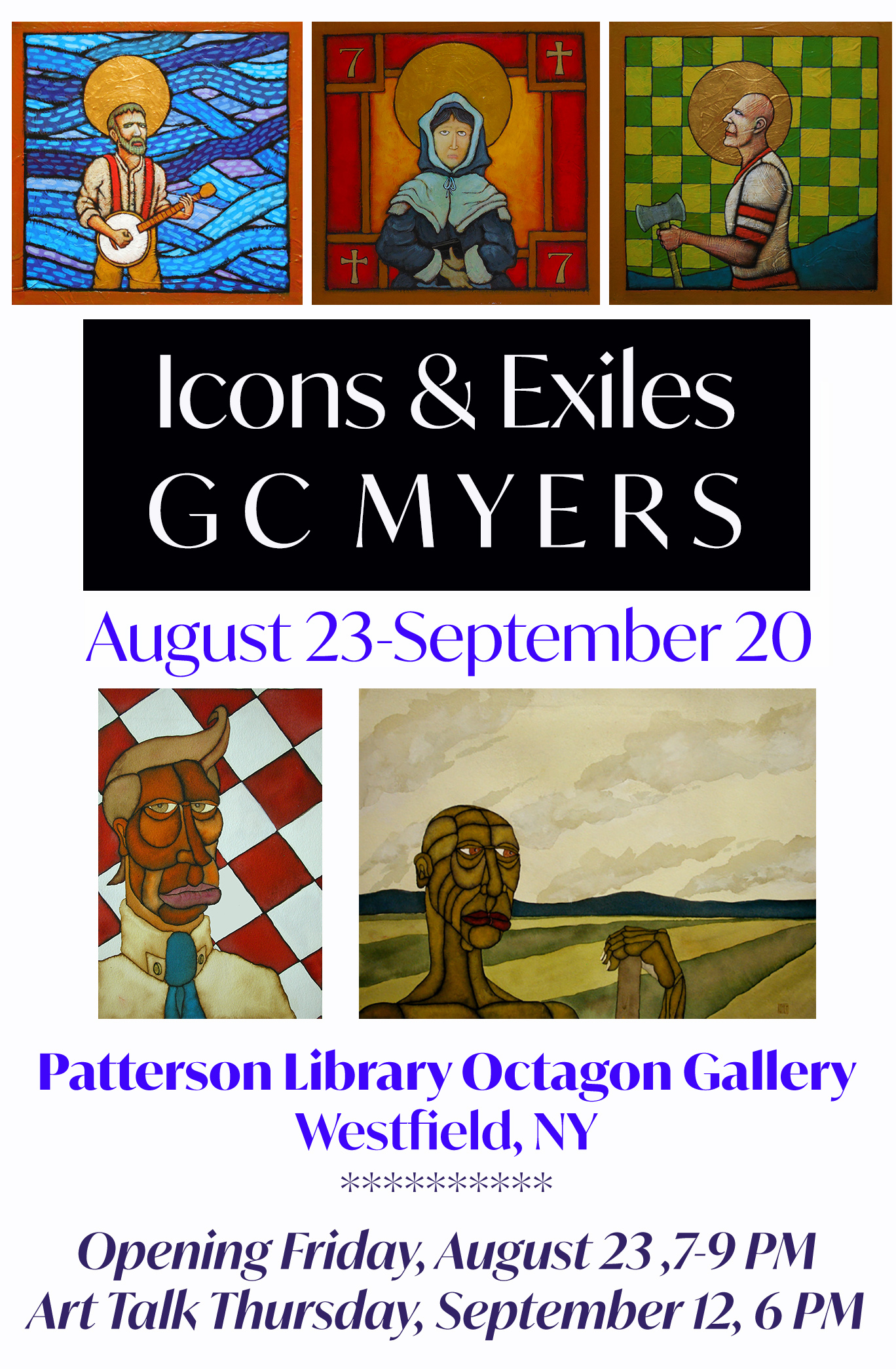 On the road today, off to deliver the work for my Icons & Exiles show that opens Friday at the Octagon Gallery at the Patterson Library in Westfield, NY. It’s out in the rural reaches of far western New York, where the foothills of the the Alleghenies flatten into rolling plains that take you to the shores of Lake Erie.