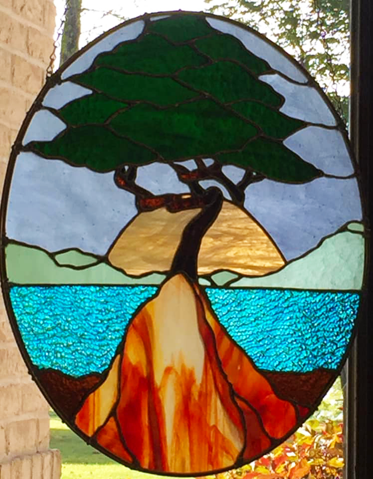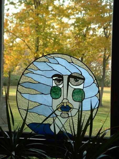 I was contacted a short time ago on Facebook from stained glass artist Annie Fatica in Erie, PA. She told me in a few short sentences that she had been a fan of my work, having a small painting obtained at the Kada Gallery in Erie, and that she was inspired by it in her own work. She included a photo of the stained glass piece shown here adding that she had created for a fundraiser for the Democratic Party her aunt was involved with.