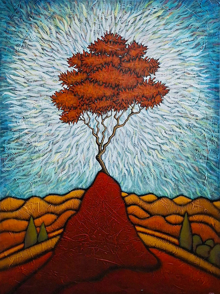 I would consider it prototypical of my work, a single Red Tree pushed forward in the picture, almost a portrait rather than a landscape. There is a burst of light that appears in the sky behind it, creating an aura-like appearance around the Red Tree’s crown. This led to its title– Corona.