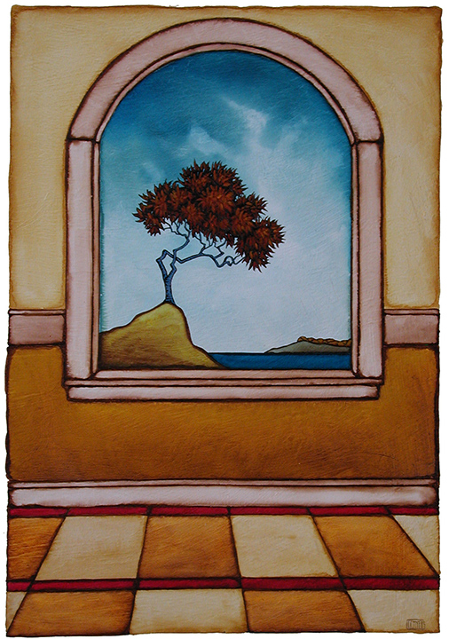 The other vintage piece is from ten years later, in 2005, and is from a limited series from that time that I called In the Window, which featured interior spaces with a window looking out on a landscape, which was the focal point of these pieces. This particular painting, In the Window: Dream Away, shown here on the right, was one of the first from that series.