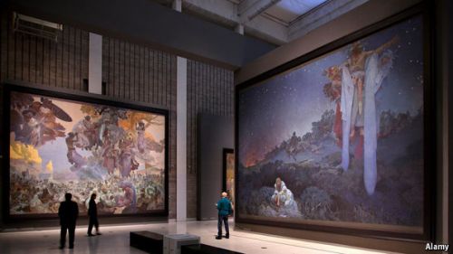 They somehow survived occupations of Czechoslovakia by both Nazis and Soviets who both saw the work as being counter to their ideologies. Mucha died soon after being interviewed by the Gestapo in 1939. The paintings are now in possession of the Czech government who are in the process of creating a museum to permanently display this magnificent work. I am sharing a number of images below that show them with viewers so as to give an idea of the sheer scale of the works.