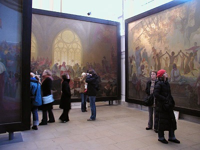 They somehow survived occupations of Czechoslovakia by both Nazis and Soviets who both saw the work as being counter to their ideologies. Mucha died soon after being interviewed by the Gestapo in 1939. The paintings are now in possession of the Czech government who are in the process of creating a museum to permanently display this magnificent work. I am sharing a number of images below that show them with viewers so as to give an idea of the sheer scale of the works.