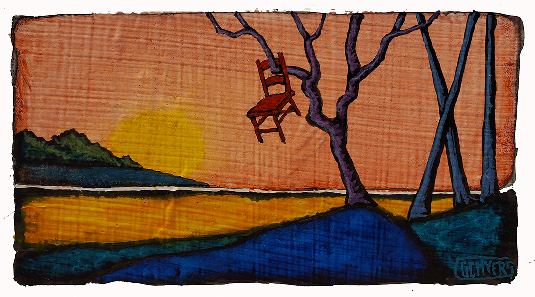 The idea of a tree growing through and lifting an object such as a chair, which is very representative of human existence, is a continuation of that early fascination. It wasn’t until I had painted several pieces with the hanging chair that I began to also see the symbolism of the empty chair, which in some cultures represents the recently deceased. That is what I often see now in that hanging tree– the family members and ancestors who have passed on.