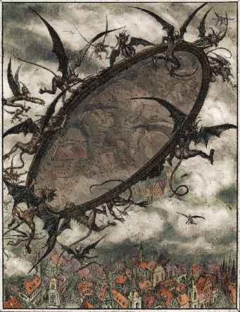 The trolls ran about all over with the mirror, till at last there was not a country or a person which had not been seen in this distorting mirror. They then decided to fly up to heaven with it to mock the angels and Our Lord Himself.