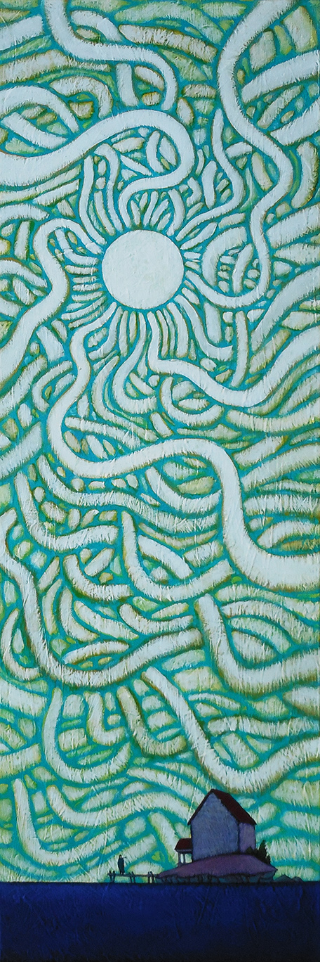 It is the mystery of this whole thing that I am trying to capture with much of the work from this upcoming show. The landscapes in these paintings are spare, often small islands or sailboats on the seas or lone trees or houses on wide plains. As in this piece, they are set low in the picture plane in a way that, for me, symbolizes the smallness or insignificance of the ephemeral nature of our existence in relation to the vast and seemingly eternal energy represented by the sky.