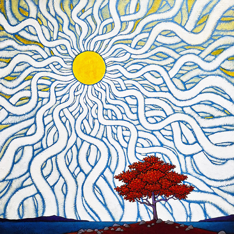 This new painting, Quiet Revelation, reminds me of the appearance of one of these rare moments of quietude. For me, the Red Tree here seems to have been able to block out the clang and furious rumble of this world, elevating to a point where it can observe the reality and harmony of the animating force that is just beyond our measure.