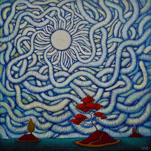 Though I love the Japanese ukiyo-e prints depicting scenes of the earthly pleasures of that era, it’s this Buddhist definition that I feel better suits the new painting shown at the top, The Floating World. That thought was not in mind when I painted it but it soon became evident that, for me, those small islands represented our tenuous and temporary existence here. The basketlike weave or entanglement of the sky represents our ultimate destination, a return to our place in the harmony and rhythm of that universal energy.