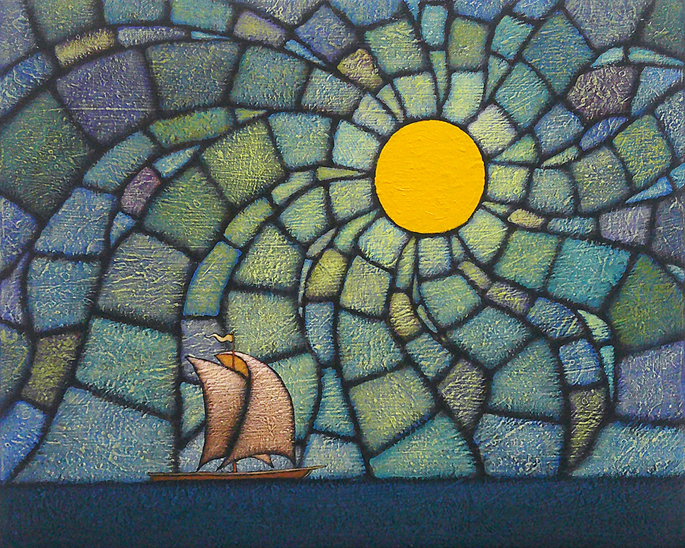 Hope and relief are what I find in this new painting. I had a hard time titling it because it does so many things for me that focusing on one thing seemed to leave out others that seemed as vital for me. But it was the ease of the boat going into the many colors and pattern of the sky that captured me. I feel as though I can get lost in the colors of the sky here, each block of color like a new burst of flavor and feeling.