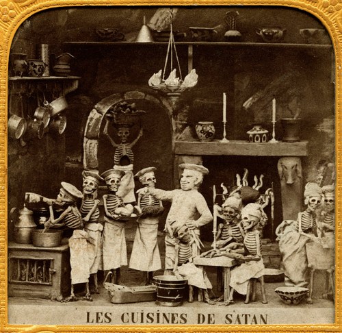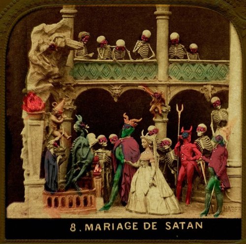 In my research I came across a post from several years back that featured these photographic oddities. I thought they would be fitting companions for Baudelaire’s words. These images are intended for the stereoscope which was invented in Paris in 1850 and became a worldwide sensation over the next decade with its three-dimensional imagery. In 1861, a series of 72 of these stereoscopic photos were printed anonymously in Paris that consisted of macabre scenes of Satan and various aspects of Hell. Called Les Diableries, these plates were a drastic turn away from the often-mundane photos seen in early stereoscopes and were quite the hit in 1860’s Paris.