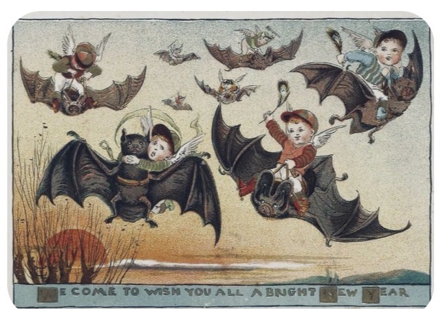 Toddlers flying at us on the back of bats on New Year’s Eve. I was going to say to say that those Victorians were just a little off then out of the dark a whole bunch of these bat-riding babies descended on me this morning. Getting a jump on the holiday, I guess.