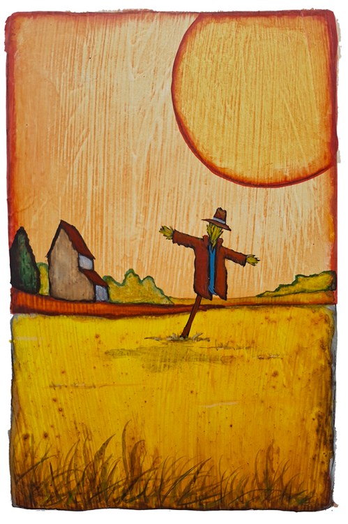 As for the painting, the detail that most intrigued me is the way the house and the scarecrow are leaning in opposite directions. If the house is the ordered life and the scarecrow is the daydreamer, perhaps the space between them is where creativity will emerge.