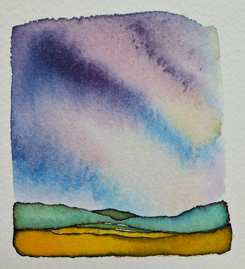 On this particular little piece, I had an idea of how I believed the colors of the sky would merge and blend. It was something I had done many times before over the past year and I had certain expectations. What emerged after I dropped the colors together was completely different than what I had anticipated. It was mélange of pastel colors., pink and yellow and robin’s egg blue. An Easter egg. Not even close to what I wanted or expected which was bold deep colors.