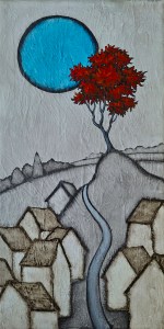 I see this scenario in this painting, Blue Moon Rising. I see it as the Red Tree observing the unusual Blue Moon rising. It alone questions the why of it all while its neighbors in the houses around it remain locked away. Unseeing and unquestioning. The colors in the Blue Moon and the Red Tree, for me, symbolize the connection created by the Red Tree’s observation and wonderment. The very questioning of why the rising moon is blue creates a connection to it.