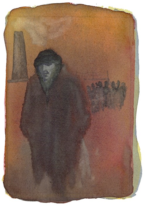 That brings us to the early painting I am featuring today. It was painted on January 11, 1995 and has the title Camp scrawled at the bottom of the sheet of watercolor paper on which it was painted. In the entry in my painting diary for this piece on that day, I wrote: Very dark. Concentration camp, remnant of dreams past. Hard to critique this objectively.