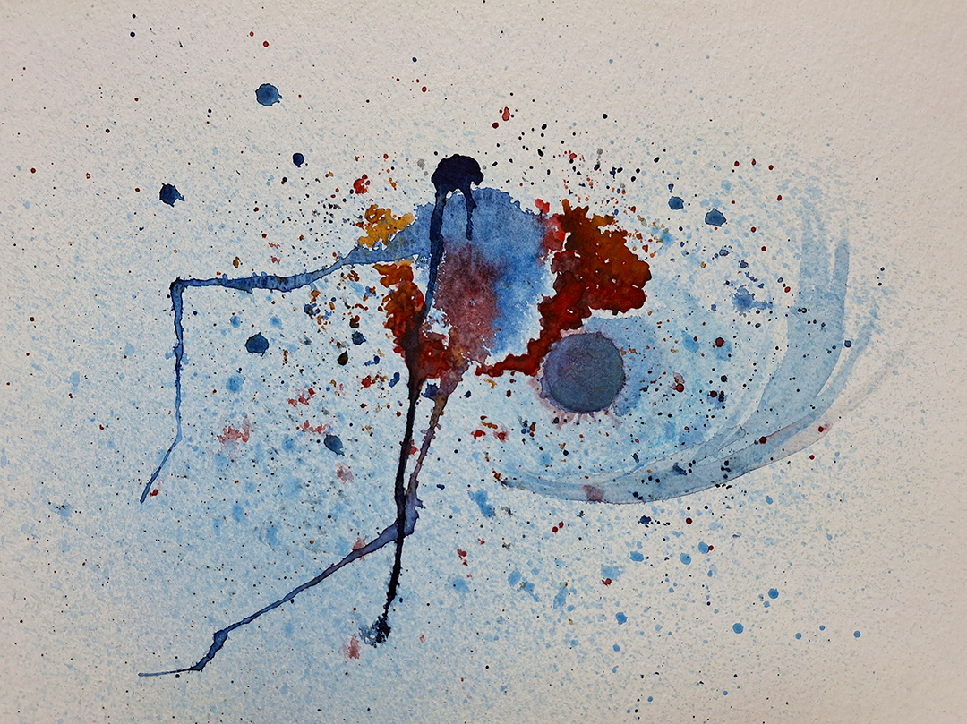 At one point, I was experimenting with moving paint on the surface with a simple drinking straw. Placing a drop in one spot, I would direct it by blowing through the straw. I loved the tendrils of paint it created, long and thinning as they progressed. If I changed the direction of my blowing, it created a lovely organic bend that mimicked the branch of a tree. I also applied thin watercolor washes as I normally would as well as playing with this same thinned watercolor in an atomizer to create an interesting background texture.