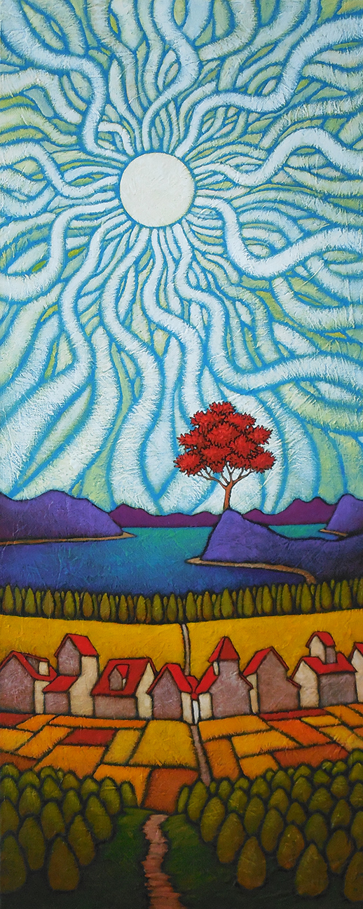 Much of the work from the Entanglement show has to do with how we, comprised as we are of bands of energy, are interwoven with all other things. Many of the paintings depict the interaction of the individual, often represented by the Red Tree, with the bands of energy that surround us.