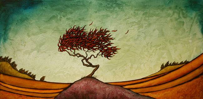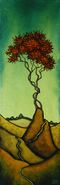 For me this piece comes back to the natural grace of the tree form. This is something I’m searching for in each piece. To me, this is more important than the reality of the representation because if it’s there the painting makes sense, even though though some details may seem illogical when you take the time to consider them. I think this piece is a prime example of this. The fact that there is a strange red tree (or trees) perilously perched on this strange little peak should seem odd and out of place in most cases but for me, and in my mind, the flow and rightness of the elements makes me see the scene as perfectly logical and natural.