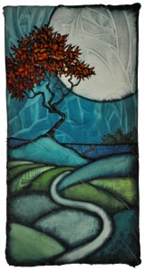 I have a lot going on this morning so I’ll quickly show you this new piece that I call Blue Moon (You Saw Me Standing Alone) , taken from the lyrics of the old song.  There is something both restful and dreamily melancholic in these blue nocturnes.  There is also a wonderful sense of harmony created by the different blue tones in it coming together.  It may be a small piece, only about 4″ by 8″, but it has visual oomph, particularly in the way the blues hug the texture of the sky.  The color thins near the top of each ridge then pools darker in the depressions creating a nice rhythm in the blue night sky around the white eye of the moon.