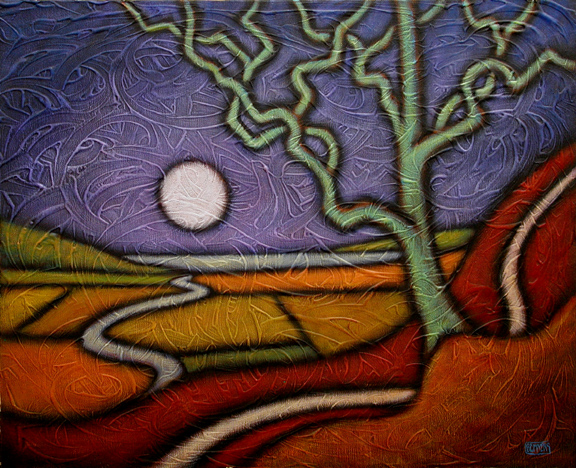 With this piece, I have chosen to forego the kinship that the red tree often fosters with the viewer, acting as a greeter inviting them to enter and feel comfortable within the picture plane. In Endless Time the viewer is left to their own devices when they enter the picture. There is no place to hide, no cover. They are exposed to the weight of the sky and the roll of the landscape. They are alone with not a sound nor distraction.