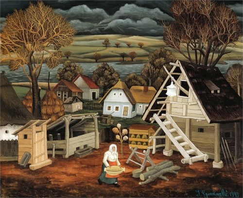 Several years back, I wrote here about the late Croatian painter Ivan Generalic (1914-1992). I don’t really know how his work is categorized. He mixed folk art, rural Eastern European village life and folklore, and allegory in a painting style that was richly colored and inviting. It was most often painted on glass which increased its vibrancy and glow. It had a certain charm that reminded me of the jungle paintings of Henri Rousseau.