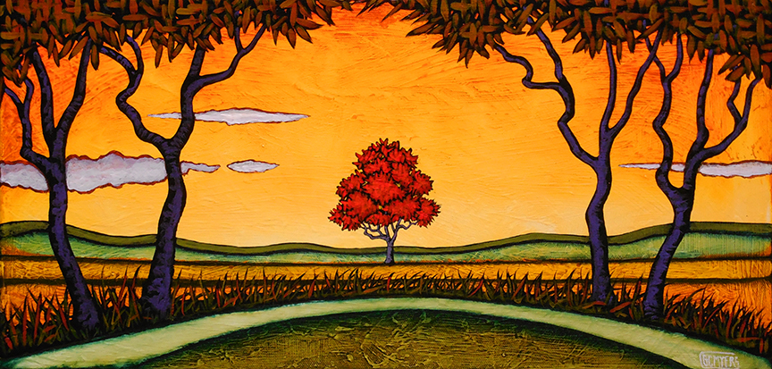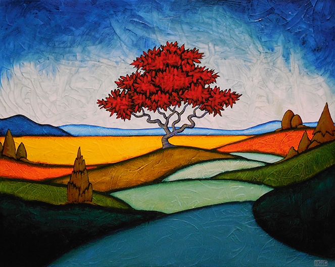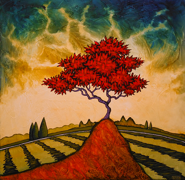 Called Blue Awakening, this 18″ by 24″ painting on panel has a simplified and almost naive appearance at first glance. But the blue of the sky set against the pale whiteness of the moon changes the piece from a folksy vignette to one of meditative wonderment. The Red Tree here takes on a glow that speaks of a new understanding or acceptance of its place and purpose in the universe. It represents a true awakening of the spirit for me.