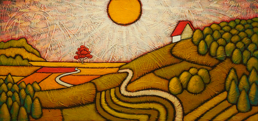 The painting at the top is a new painting, a 24″ by 24″ canvas, that is part of my Home+land show that opens this Friday at the West End Gallery. Titled In the Air of Freedom, it represents for me the freedom that I have found in the last twenty years of painting. Painting has given me a means of free expression, a voice to send out into the world, a contentment and purpose that I struggled and failed to find to find in the years before I came to it. It has come to define my own freedom. I see the Red Tree representing that free expression and the fields behind it representing for me the labor and responsibility that accompany it.