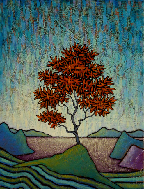 Well, when I was painting this piece there just seemed to be something a bit different in the feel of it before I had even opted for the blue ball in the sky. Maybe it was the ultra warmth of the red and yellows that made me want to counter it somehow or maybe that odd feeling made me want to accentuate it even more. I am not really sure.