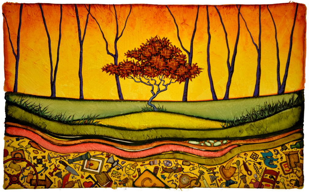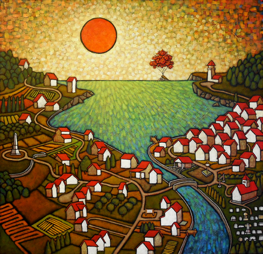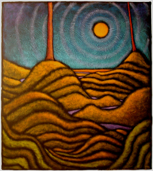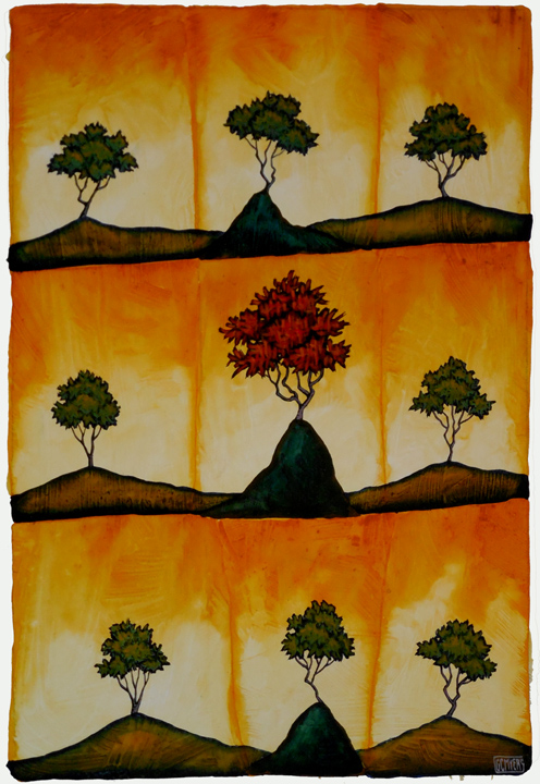This struck me as a nice opportunity to show a few paintings that have not been seen in a while, pieces that have been biding their time with me in the studio. Included is the piece shown to the right, Peaceful Tidings, a piece measuring about 18″ by 36″ on paper. It is a painting that inexplicably only showed in one gallery for a short time before coming to the studio. Why I have kept it under wraps is a question that I can’t answer. It has always seemed to be here, always drawing my attention when I am near it. So this seems like a nice chance to let it out once more.