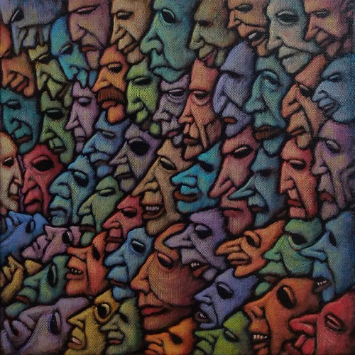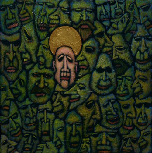 The other day, I was working on another of the Multitudes pieces, a 12″ square canvas that was featuring a halo or at least a gold orb hanging over one of the faces. The painting started with this central haloed character and the rest of the faces grew out from it. The faces other than the one with the halo were originally going to be many shades of blues and purples but while I was working, a song from Bruce Springsteen‘s first album in 1973, Greetings From Asbury Park NJ, came on.
