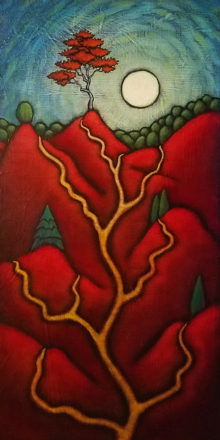 It is a painting that is still on the easel, near completion or so I think. I am in that part of the process where I am still examining it, absorbing it to see what it has for me, what it’s trying to say to and for me. And here, the music created a narrative line that pulled me and the image together.