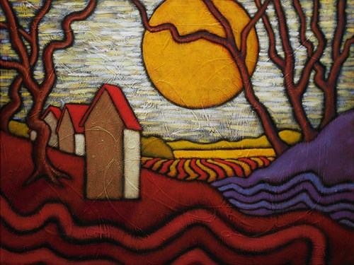 The piece shown here is a new painting, 24″ by 12″ on canvas, that elicits the elation I described above. It checks every box for what I wanted from it. It has an equilibrium of fineness and roughness that appeals to me. There is a cleanness in its design that makes it feel solid and whole to my eye. It draws me in and lets me feel that I am the Red Tree here and it is a fulfilling experience.