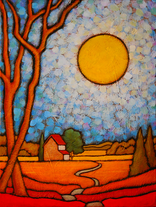 It is the mystery of this whole thing that I am trying to capture with much of the work from this upcoming show. The landscapes in these paintings are spare, often small islands or sailboats on the seas or lone trees or houses on wide plains. As in this piece, they are set low in the picture plane in a way that, for me, symbolizes the smallness or insignificance of the ephemeral nature of our existence in relation to the vast and seemingly eternal energy represented by the sky.