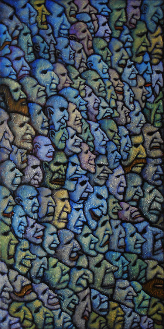 The piece from that series, shown here on the right, is what I would consider the title piece for the series, bearing the title Multitudes. I see the faces in these pieces as being parts of me, small parts that make up a greater whole. Just as the masses of people that make up a nation, it is always filed with paradox and contradiction.